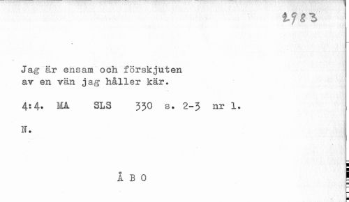 //// tftz //// Jag är ensam och förskjuten av en vän jag håller kär. //// 4:4. MA SLS 330 s. 2-3 nr 1. I. //// v //// Ibo I ////
