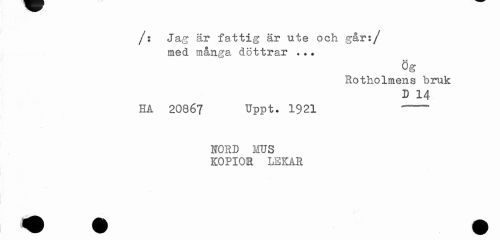 //// /: Jag är fattig är ute och går:/ med många döttrar ... //// Ög //// Rotholmens bruk //// D 14 //// HA 20867 Uppt. 1921 - //// HORD MUS KOPIOR LEKAR ////