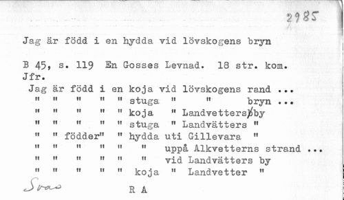 //// ... //// Jag är född i en hydda vid lövskogens bryn //// i //// B 45» 119 Gosses Levnad. 18 str. kom. Jfr. //// Jag är född i en koja vid lövskogens rand ... " " " 11 11 stuga 11 fl bryn ... //// M M w " n koja 99 Landvetterspby M 11 11 " " stuga " Landvätters 11 ft 11 födderft M hydda uti Gillevara tf 11 " n 11 ff uppå illkvetterns strand ... //// !t M 11 w " 11 vid Landvätters by " " M w " koja M Landvetter n | //// Str*^ E A | ////