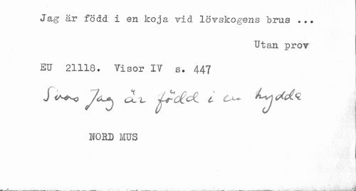 //// Jag är född i en koja vid lövskogens brus ... //// Utan prov //// EU 21118. Yisor I? s. 447 //// J J^j ^ L t C^ lyM* //// HORD MUS //// . j ////