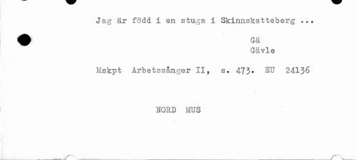 //// Jag är född i en stuga i Skinnskatteberg //// Gävle //// Mskpt Årbetssånger II, s. 473- EU 24136 //// HORD MUS ////