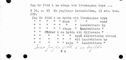 //// Jag är född i en stuga vid lövskogens bryn ... //// B 35» s. 95 Sn ynglings levnadsöden, 19 str. kom. Jfr. //// Jag är född i en hydda vid lövskogens bryn //// w ti ti tt tt koja tt tt raad //// rt " 11 w w " M Landvetters by //// M rt u n 11 stuga M Dandvätters " //// ff 11 födder i en hydda uti Gille var a " //// t! 11 H " " ft uppå Ålkvetterns strand //// M M " w M M vid Landvätters by //// " H rf rf M koja " Landvetters n ////