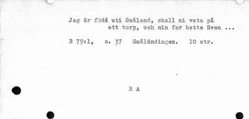 //// i //// Jag är född uti Småland, skall ni veta på //// ett torp, ooh min far hette Sven //// B 79J1> St 37 Smålandingen» 10 str. //// / //// \ //// p //// • • ////