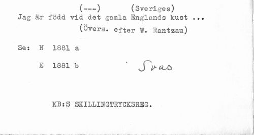 //// (---) {Sveriges) //// Jag är född vid det gamla Englands kust //// (övers, efter W. Hantzau) //// Ses N 1881 a //// E 1881 b ' //// i i //// KB j S SKILLIHGTRYCK3HEG. ////