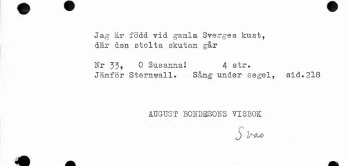 //// Jag är född Tid gamla Sverges kust, där den stolta skutan får //// Hr 35, 0 Susanna! 4 str. //// Jämför Sternwall. Sång under segel, sid.218 //// AUGUST B0HDES01S VISBOK //// S ////