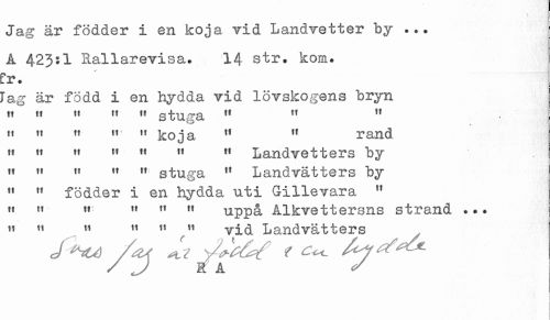 //// v //// Jag är födder i en koja vid Landvetter by ... Å 423*1 Rallarevisa. 14 str. kom. //// "ag är född i en hydda vid lövskogens bryn »t tt tt tt t« stuga 11 " 11 //// tt tt tt tt tt koja ti tt rand //// » « " " " 11 « Landvetters by //// 11 " fl 11 n stuga 11 Landvätters by //// " w födder i en hydda uti Gillevara " //// " 11 w tf ft 11 uppå Alkvettersns strand ... //// " 11 " t1 " vid Landvätters //// / j RA y ////