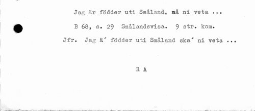 //// Jag är födder uti Småland, må ni veta . • * //// B 68, s. 29 Smålandsvisa. 9 str# kom» Jfr. Jag ä' födder uti Småland ska' ni veta ... //// R A //// --- ---__---___„___ _ ^ ___ ___ . ////