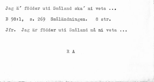 //// Jag ä/ födder uti Småland ska' ni veta , .. | //// B 98:1, s. 269 Smålandningen. 8 str. //// Jfr. Jag är födder uti Småland må ni veta ... //// R A //// ¦i U ÉÉ M _ _ ////
