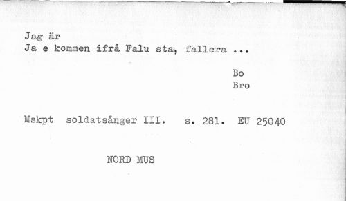//// Ja g är //// Ja e kommen ifrå Falu sta, fallera ... //// Bo Bro //// Mskpt soldatsånger III. s. 281. EU 25040 //// * //// HORD MUS //// ¦ ////