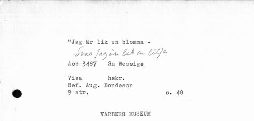 //// "Ja<ge ar //// 1 x k en blomma - //// Acc 3487 Sn Wessige //// Visa hskr. //// Ref. Aug. Bondeson //// 9 str. s. 48 //// VARBERG MUSEUM ////