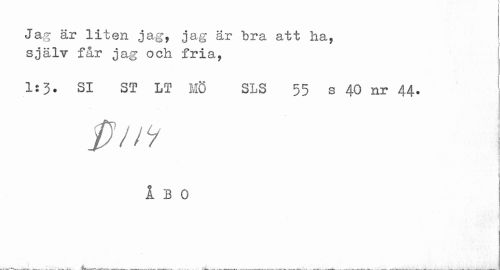 //// Jag är liten jag, jag är bra att ha, själv får jag och fria, //// Is 3. SI ST LT MÖ SLS 55 s 40 nr 44. //// pni //// A B 0 ////