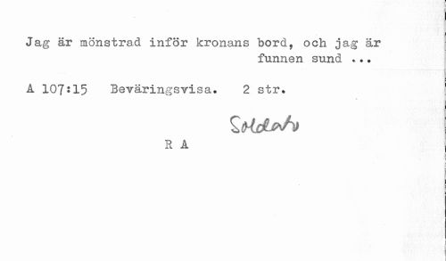 //// Jag är mönstrad inför kronans bord, och jag är //// funnen sund *.? //// A 107*15 Beväringsvisa. 2 str* //// v //// R A //// i //// i ////