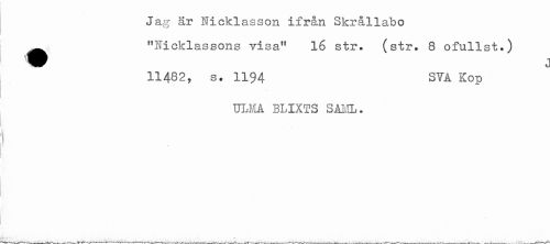 //// Jag är Nicklasson ifrån Skrållabo //// •"Nicklassons visa" 16 str. (str. 8 ofullst.) //// 11482, s. 1194 SVA Kop //// ULMA BLIXTS SAML. //// [ //// 41 * ////