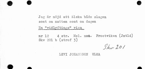 //// Jag är nöjd att älska båda slagen somt om natten somt om dagen //// Sn "vidlyftinffs11 visa //// nr 12 4 str. Mel. nod*. Frostviken (Jmtld) Skv 201 b (strof 3) //// fÅM-lO/ //// LEYI JOHANS SOI ULMA //// M ////