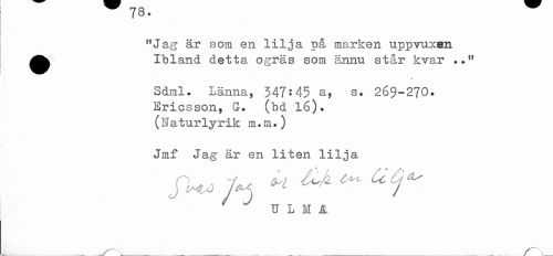//// /ö. //// 11 Jag är som en lilja på marken uppvuxen ^^ Ibland detta ogräs som ännu står kvar •." //// Sdml. Länna, 347:45 a, s. 269-270. Ericsson, G. //// (bd 16). (Naturlyrik m.m.) //// Jmf Jag är en liten lilja //// fUö ^ ^ ^ //// U L M 1 ////