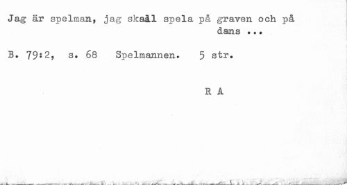 //// Jag är spelman, jag skaål spela på graven och på //// dans *?* //// B. 79*2, s. 68 Spelmannen. 5 str. //// R A //// v..., . ___ ___ . ... ... ////