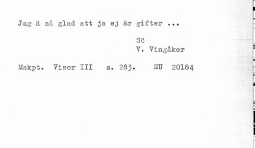 //// Jag ä så glad att ja ej är gifter ... //// SÖ //// V. Vingåker 1 //// = //// Mskpt. Visor III s. 283. EU 20184 ¦ //// i ////