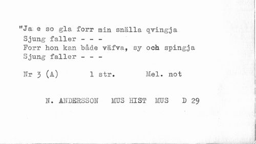 //// I //// 11 Ja e so gla förr min snälla qvingja Sjung faller - ~ ~ //// Porr hon kan både väfra, sy och spingja Sjung faller - - - //// Nr 3 (A) 1 str. Mel. not //// i //// N. ANDERSSOM MS Hl ST MUS D 29 //// » • //// i ////