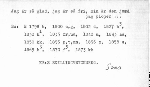 //// Jag är så glad, jag är så fri, min är den joard //// jag plöjer .•. //// Se: E 1798 b, 1800 c,g, 1802 d, 1827 h^, //// 1850b1. 1835rr,uu, 1840., 1845 aaf //// 1850 kk, 1855 P»t,mm, 1856 z, 1858 e, //// 1865 ii5, 1870 f5, 1873 kk //// s //// KB s S SKILLINGTRYCKSREG. //// J i^-o //// I I //// I //// k ////