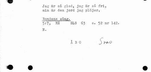 //// > //// Jag är så glad, jag är så fri, min är den jord jag plöjer, //// Bondens sång» //// 5:7, IB SLS 65 s• 52 nr 142. //// i //// N. //// ÅBO 3 //// • • • ////