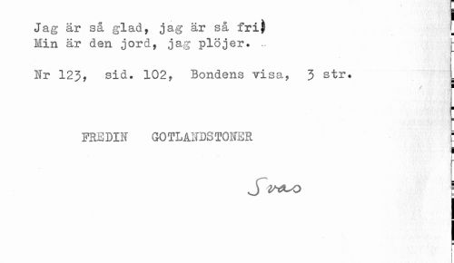 //// * I //// Jag är så glad, jag är så frif //// Min är den jord, jag plöjer. .. t //// I //// Nr 123, sid. 102, Bondens visa, 3 str. //// / ii j" //// PSEDIIf GOTLAHDS TONER C //// ¦ //// t //// i //// r \ ////