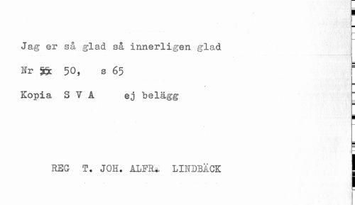 //// ... i //// Jag er så glad så innerligen glad //// Nr §5e 50, s 65 1 //// / //// Kopia SVA ej belägg P //// 1 //// REG T. JOH. ALFE*. LINDBÄCK j ////