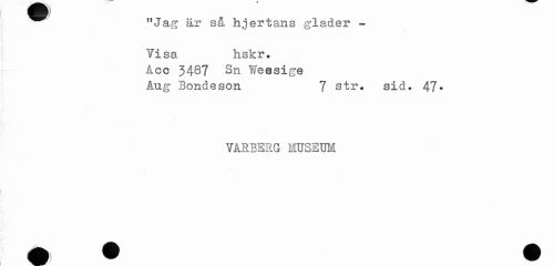 //// w * //// ^^ "Jag är så hjertans gläder - //// Visa hskr. //// Åec 3487 Sn Wessige //// Ang Bondeson 7 str* sid. 47* //// TÅRBERG MUSEUM ////