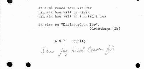//// Ja e så kened forr min Per //// Han sir han vell ha gevär //// Han sir han vell ud i kried å lua //// En visa om "Karingapågen Per". //// Gårdstånga (Sk) //// L U P 2508:13 ////