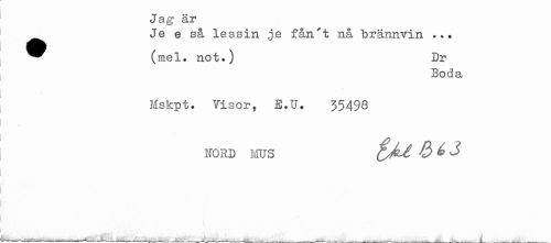 //// Jag är //// Je e så lessin je fån't nå brännvin ... //// ^^ (mel. not.) Dr //// Boda //// Mskpt. Tisor, E.U. 35498 //// UORD MUS ////