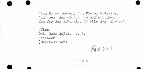 //// 3/3? Sd ledsen, jag far ej brännvin, jag tror, jag slutar upp med alltihop, Men får jag Brännvin, då blir jag 'gläder'»* //// (Visa) //// Sal. Boda.403s4? s* 3- //// Sandback. //// (Dryckesvisor) //// U L M A ////