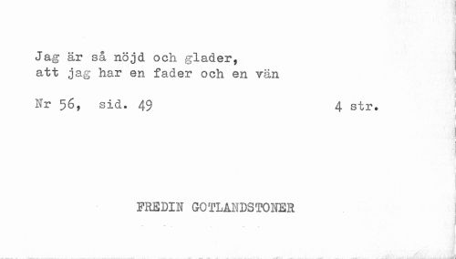 //// ¦ i //// Jag är så nöjd och gläder, att jag har en fader och en rän //// .1 //// Nr 56, sid. 49 4 str. 1 //// 'Å J //// 1 * //// . //// | //// FREDIN GOTLANDSTOMBR //// I //// ^ . ... . v. ^ . . MJ*- ^ . iVfiiil ' 1 Ull ii < Il T^i t J.i fl¥l Hk Åkmmi ////