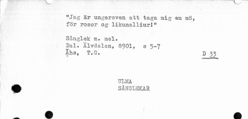 //// 1 //// "Jag är ungersven att taga mig en mö, för rosor og likunalliurl" //// Sånglek ra. mel. //// Dal. Älvdalen, 8901, s 5~7 //// Åhs, Ö?.G. D 33 //// •i- //// ULMA //// SilfGLEICAR //// i * * ////