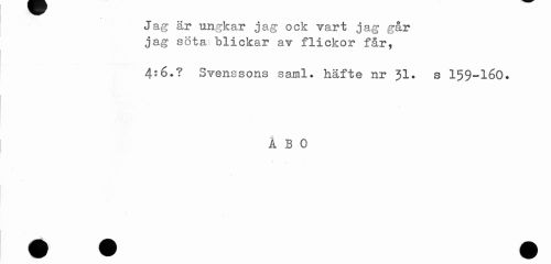 //// Jag är ungkar jag ock vart jag går jag söta blickar av flickor får, //// 4:6.? Svenssons saml. häfte nr 31. s 159-160. //// i B 0 //// i ////