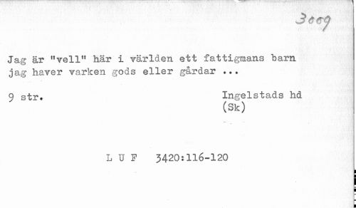 //// Jag är f,vellft här i världen ett fattigmans barn jag haver varken gods eller gårdar ... //// 9 str. Ingelstads hd //// (Sk) //// L D F 3420:116-120 //// I ////