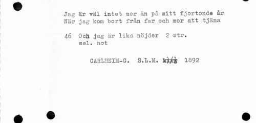 //// Jag är Täl intet mer än på mitt fjortonde år När jag kom bort från far och mor att tjäna //// 46 OcJ jag är lika nöjder 2 str. mel. not //// CARLHEIM-G. S.L.M. fe^jp 1892 ////