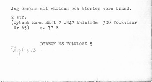 //// Jag önskar all världen och kloster vore "bränd. 2 str. //// (Dybeck Stina Häft 2 1842 Åhlström J00 folkvisor Ir 65) s. 77 B //// DYBECK MS FOLKLORE 5 //// 1 //// ^ aii>mr~-j___. ////