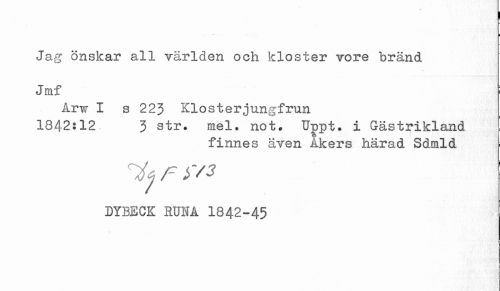 //// Jag önskar all världen och kloster vore bränd Jmf //// Arw I s 223 Klosterjungfrun 1842:12 3 str. mel. not. Uppt. i Gästrikland //// finnes även Åkers härad Sdmld //// l F ST/3 //// DYBECK HUKA 1842-45 ////