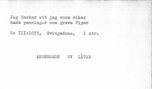 //// Jag önskar att jag vore riker hade penningar som greve Piper //// Se 111:1073, Svingedans, 1 str. //// ANDERSSON SV LÅTAR //// $ //// i //// i ////