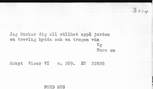 //// 3 6 //// Jag önskar dig all sållhet uppå jorden //// en trevlig hydda och en tro-en vän //// Yg //// Fors sn //// Mskpt Visor VI s. 269. EU 22828 //// ; //// t //// wn*R*n Mim - ////