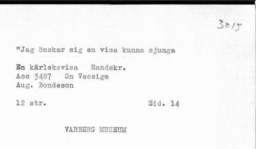 //// "Jag önskar mig en visa kunna sjunga //// -* - -* * * ..... - . * //// En kärleksvisa Handskr. //// Acc 3487 Sn Vessige //// Aug+ Bondeson //// - //// 12 str. Sid. 14 //// VARBERG MUSEUM ////