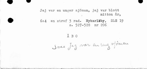 //// Jej var en unger sjöman, jej var blott //// nitton &r, //// ^ 6:4 en strof 3 rad. Nykarlgby, SLS 19 //// s. 527-528 nr 206 //// ÅBO //// i //// I ////