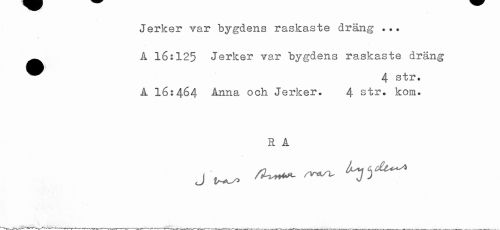 //// Jerker var bygdens raskaste dräng ... //// ^ A 16:125 Jerker var bygdens raskaste dräng //// ^^ 4 str. //// A 162464 Anna och Jerker. 4 str. kom. //// R A //// j ^ — ^^ ////