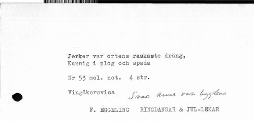 //// - //// ' - . //// .. _ ' //// i- //// Jerker var ortens raskaste dräng, //// Kunnig i plog och spada //// Nr 53 mel. not. 4 str. //// ^ Vingåkersvisa //// F. EGGELING RINGDAIiSAR & JUL-LEHAR ////