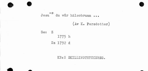 //// Jesu du v&r hälsobrunn ... //// (Av K. Persdotter) //// Se: Z //// 1775 h //// Zz 1792 d //// KB:S SKILLINGTRYCKSREG. //// - //// - ////