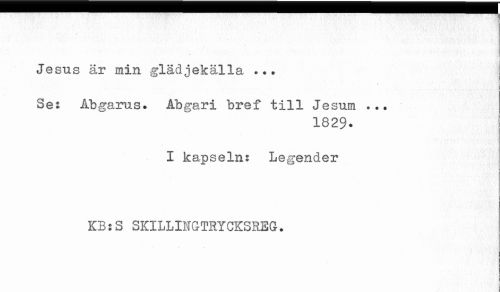 //// Jesus år min glädjekälla ... //// Se: Abgarus. Abgari bref till Jesum ... //// 1829^ //// I kapseln: Legender //// KB s S SKILLINGTRYCKSREG. ////