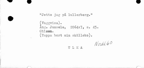 //// ! //// < //// ^^ "Jette jag på lullerberg." //// (Vaggvisa). //// Ang. Jumsele, 2064:7y s. 45- //// Ohlsen. //// (Tappa bort min skälleko). //// U L M A //// ) //// i ////