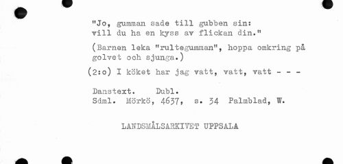 //// "Jo, gumman sade till gubben sin: //// vill du ha en kyss av flickan din." //// (Barnen leka "rultegumman", hoppa omkring på //// golvet och sjunga.) //// (2:o) I köket har jag vatt, vatt, vatt - - - //// Danstext. Dubl. //// Sdml. Mörkö, 4637, s. 34 Palmblad, W. //// LANDSNÅLSA3KIVET UPPSALA ////