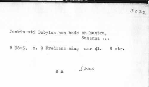 //// Joakim uti Babylon han hade en hustru, //// Susanna ... //// V ....... //// B $8:3, s. 9 Fredmans sång n:r 41. 8 str. //// RA ^^ ////