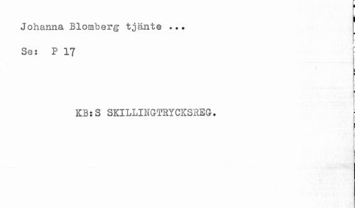 //// ; //// Johanna Blomberg tjänte ... //// * //// Se: P 17 C //// \ //// t- //// KB:S SKILLINGTRYCKSREG. //// t ////