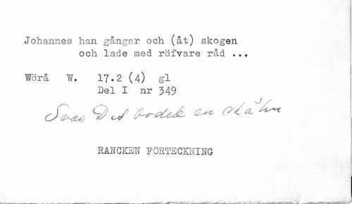 //// Johannes han gångar och (åt) skogen //// och lade med röfvare råd ... //// Worå W. 17-2 (4) gl //// Del I nr 349 //// RANCKEN FÖRTECKNING //// .. ... .. .. — . ^ ////